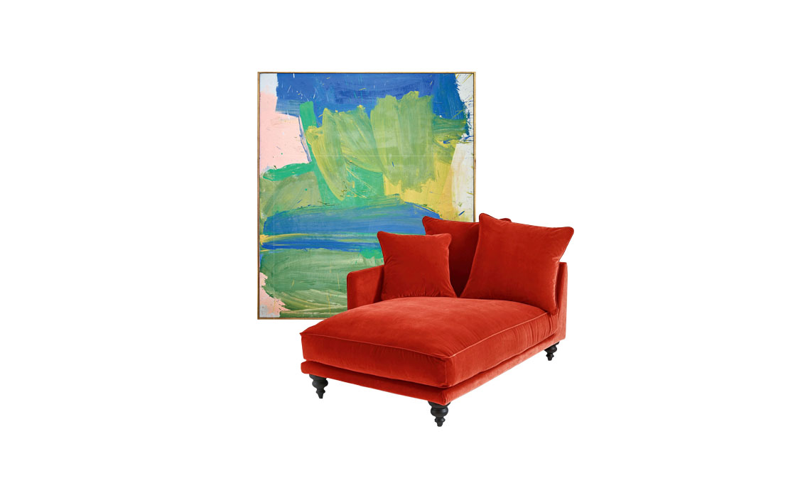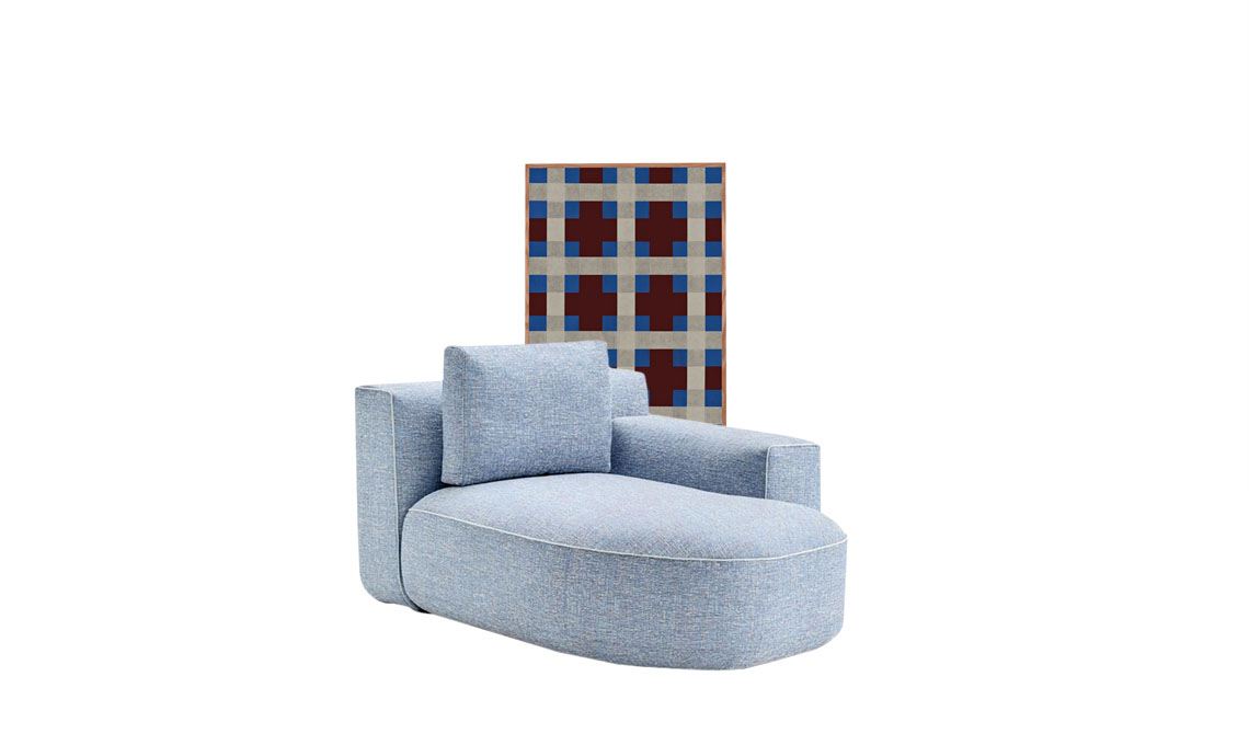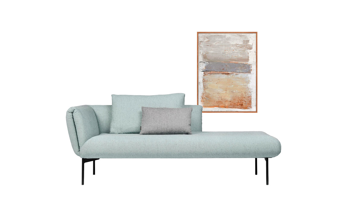 Volumi morbidi, forme arrotondate e rivestimento tessile per Jeff, il sistema modulare di Patrick Norguet [Pedrali, cm 150x100x78h]. Un gioco di ripetizioni e cromie nel quadro Nun [Evelina Kroon per Artillieret, cm 70x100]