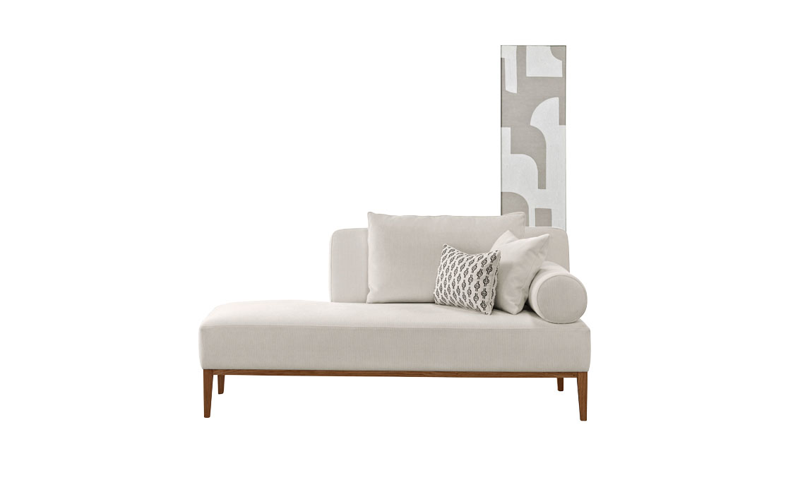 Con base in massello e rivestimento in tessuto o pelle Giò Day Bed [Ceccotti Collezioni, cm 209x80x70h]. In edizione limitata il quadro Green Shapes [Agave, cm 60x80]