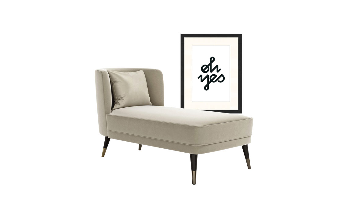 Personalizzabile nel rivestimento e nelle finiture, Key West [Capital, cm 150x73x79h]. Grafica la stampa digitale Oh Yes, con cornice [Any Image su westwing.it, cm 33x43]