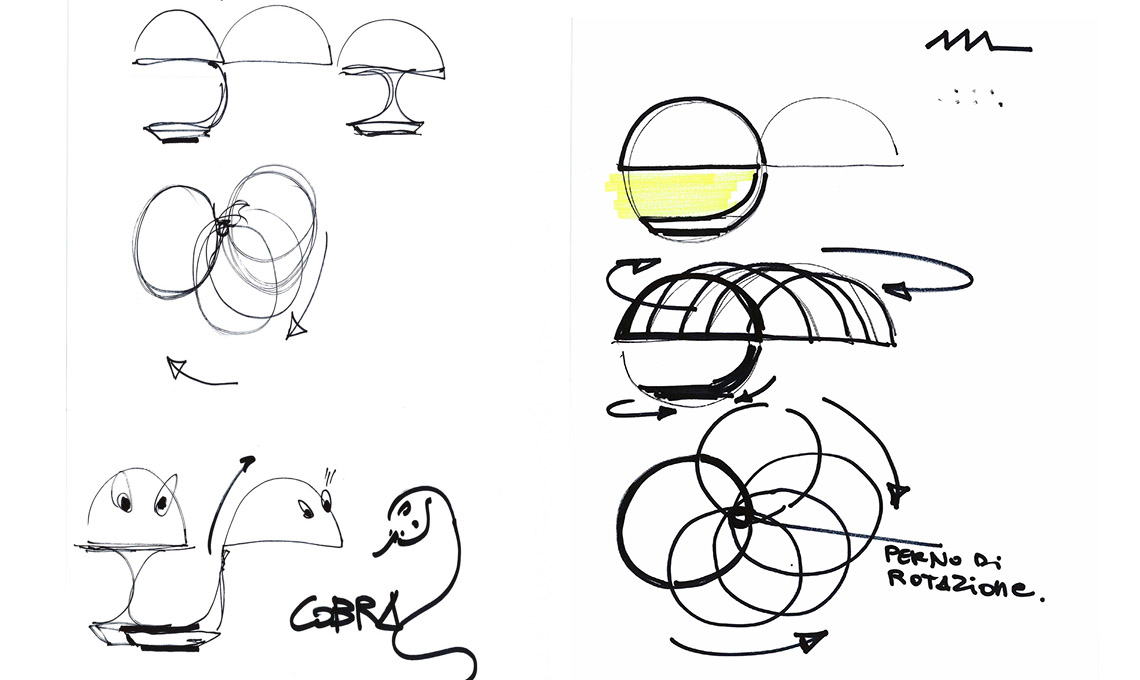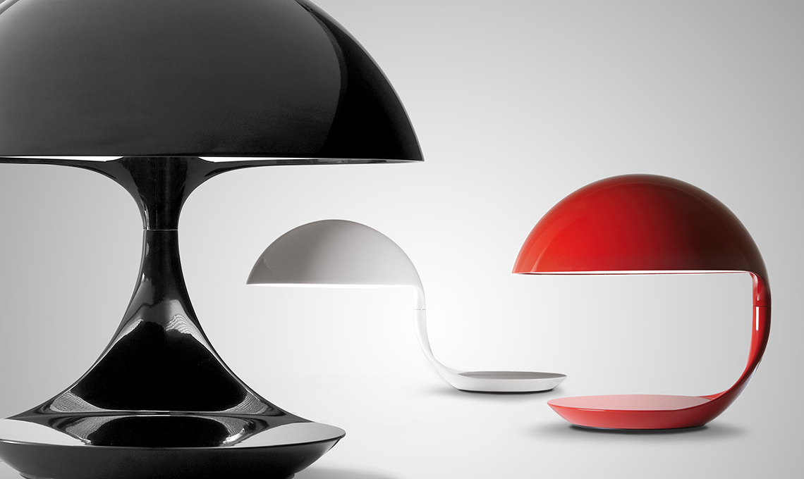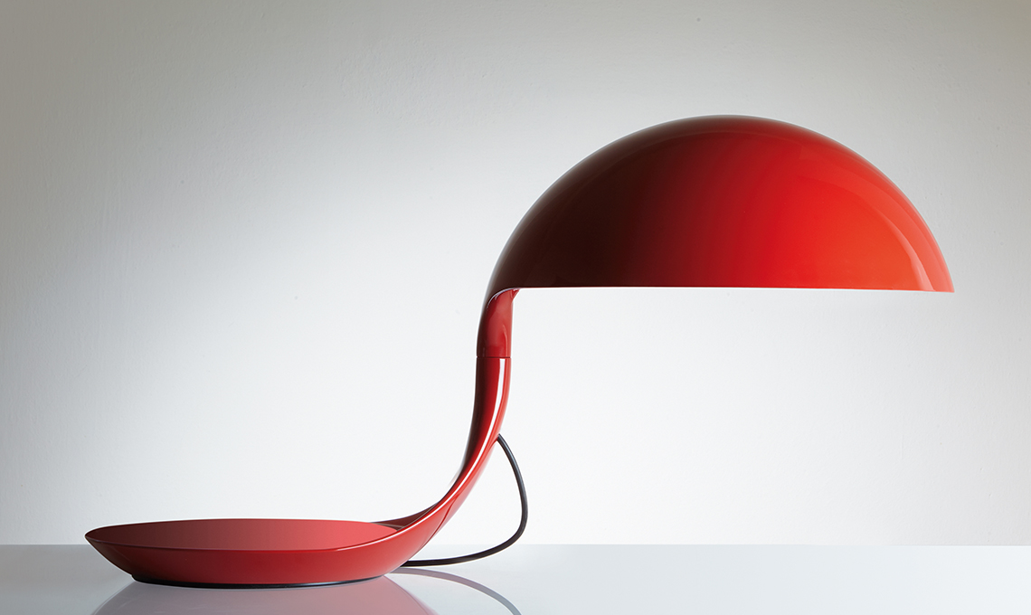 Nata nel 1968, è una delle prime lampade in stampaggio plastico, si iscrive perfettamente in una sfera, giocando tra pieni e vuoti, ma soprattutto lavora sulla sorpresa: quando un segmento della circonferenza diviene braccio e ruota la calotta nello spazio, fa assumere a Cobra movimenti da predatore, appunto. In Cobra c’è la somma delle idee e del lavoro di Elio Martinelli, fondatore della omonima azienda: il riferimento a forme semplici, geometriche, lo sguardo continuo alla natura e a un ‘lecorbousieriano’ spirito nuovo del progetto, che lo porterà, negli anni, a rinnovare il panorama intero dell’illuminazione.