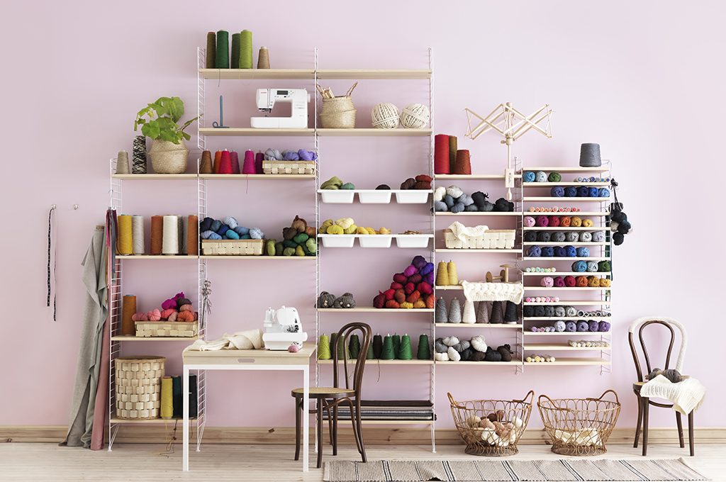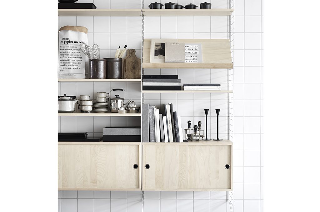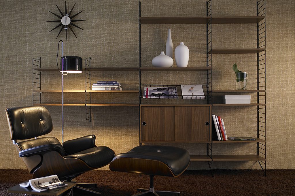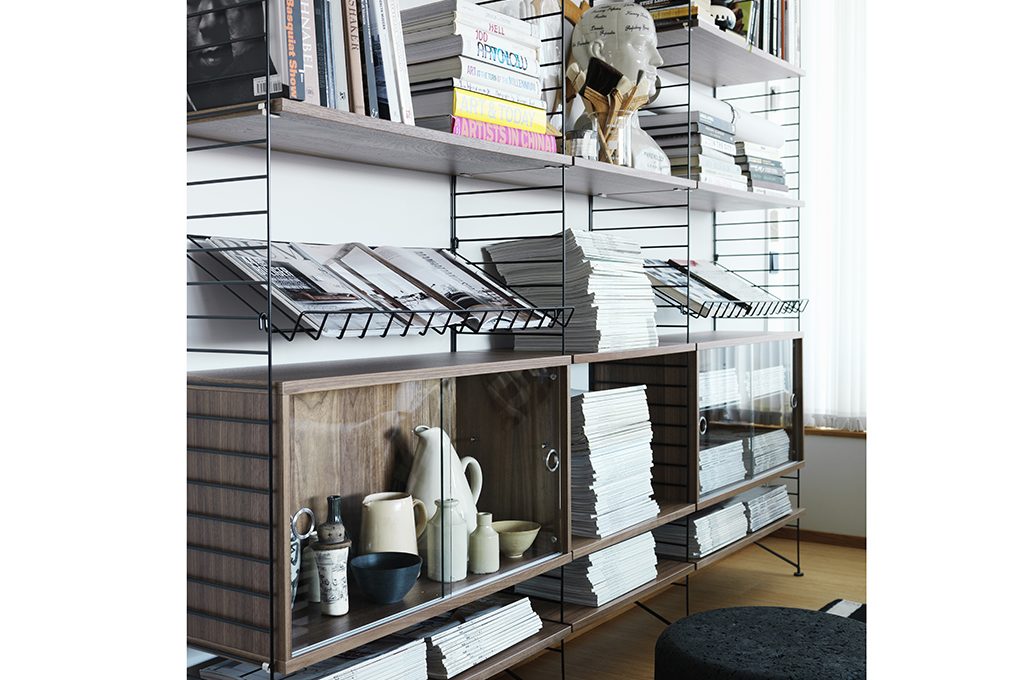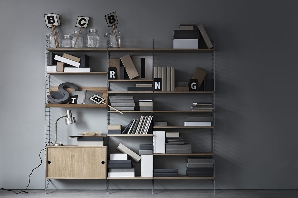 Una volta inventato, è l’uovo di Colombo: mensole, ma anche vetrinette, espositori, contenitori, si agganciano a semplici rastrelliere in tondino di ferro. Mille volte imitato, String System è un grande cult del design scandinavo