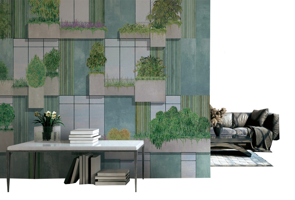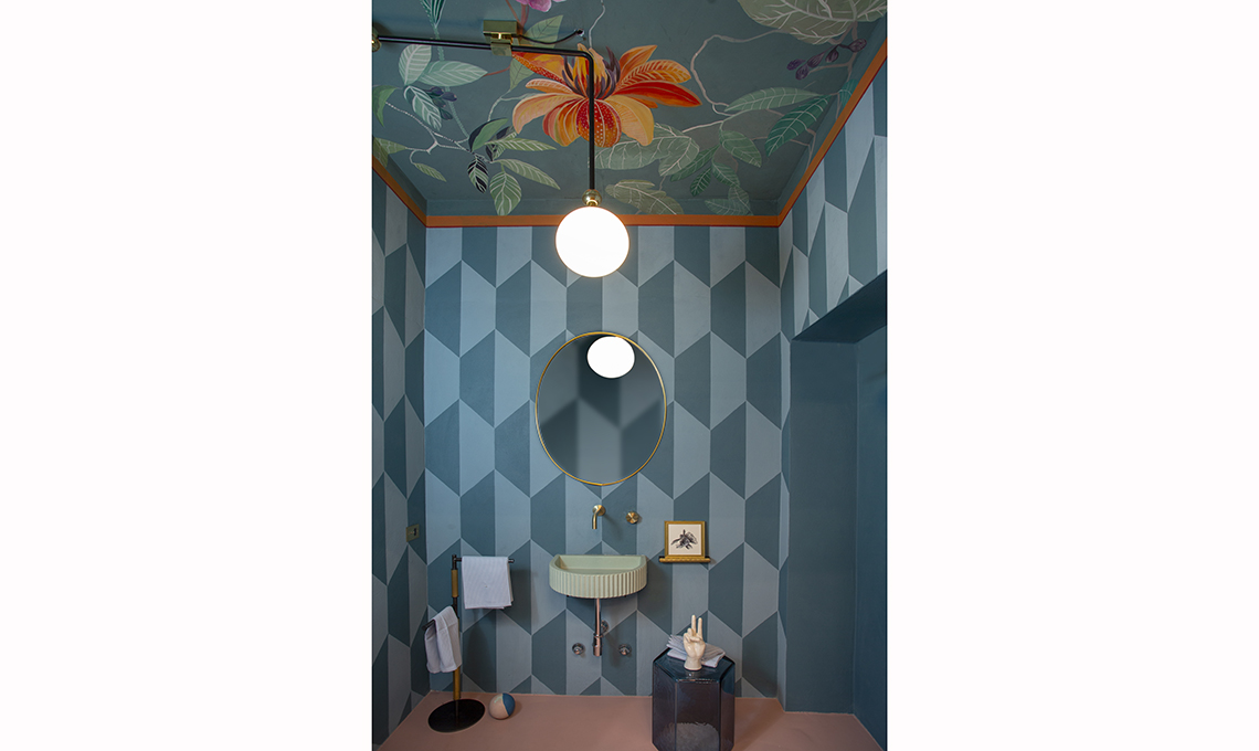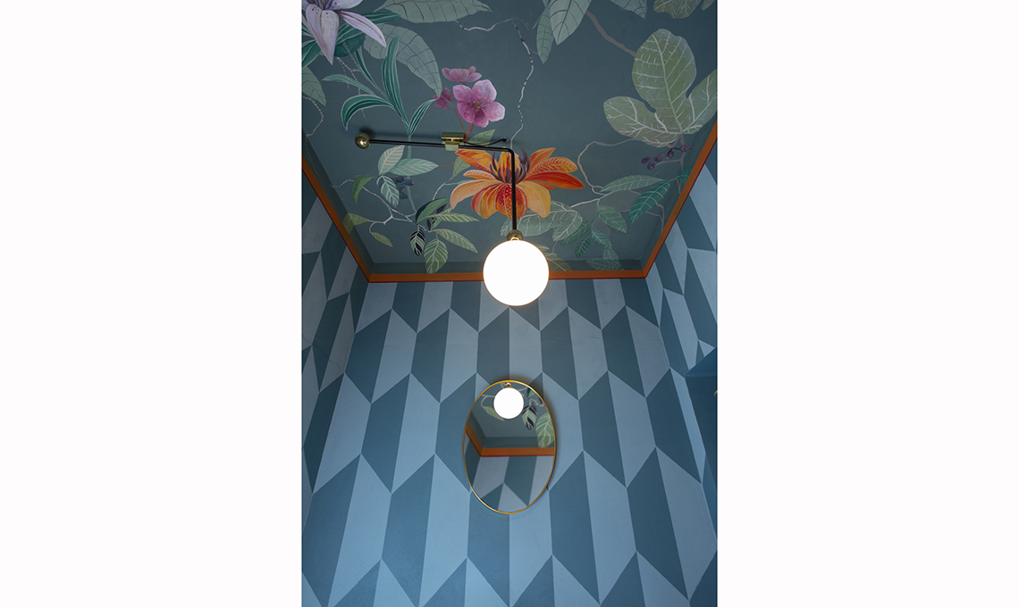 Realizzato a mano libera dalle decoratrici di Pictalab Milano [pictalab.com], il soffitto è tutt’uno con le pareti e interpreta il mood più desiderato oggi: portare la natura in casa!