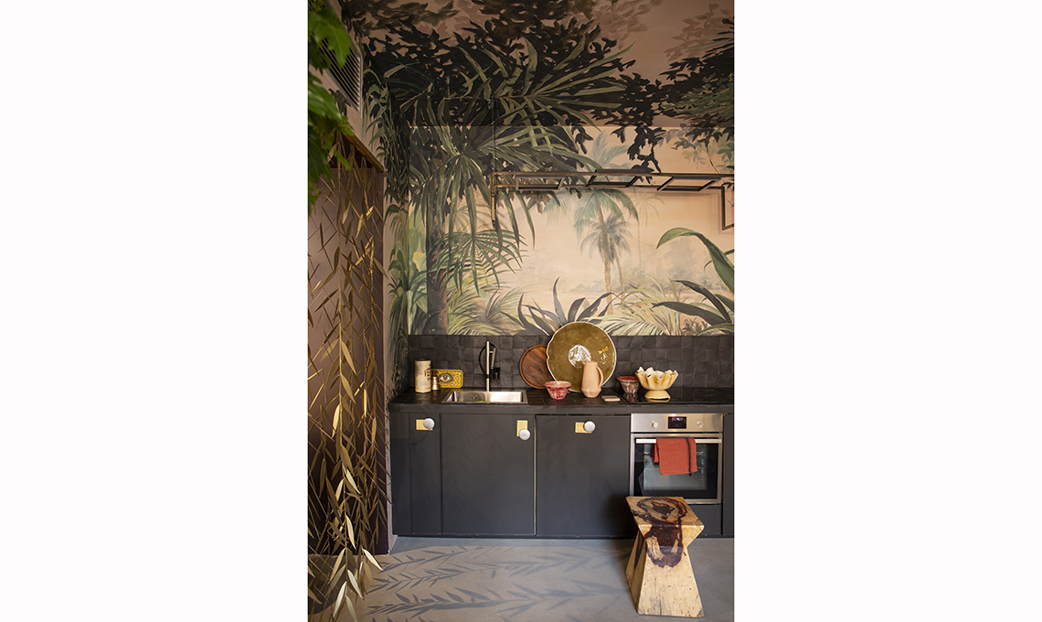 La cucina del concept store Palermo Uno in via S. Maria alla Porta 5, a Milano, con pareti e soffitto decorati da Pictalab. Mobile realizzato su disegno di Palermo Uno, alzata di piastrelle artigianali in cotto umbro [Fangorosa, cm 10x10], tavolino Zago, in legno di tamarindo [Palermo Uno € 440].