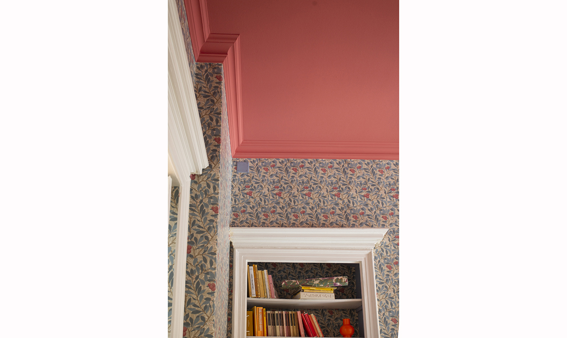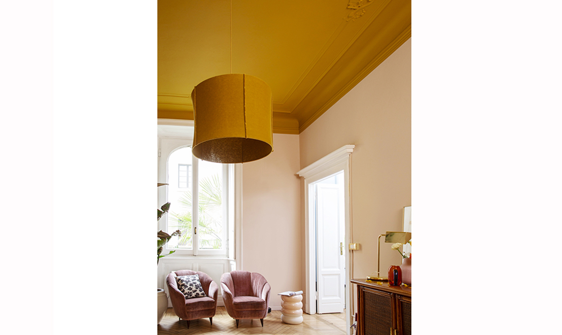 Idea n. 1: una tinta tenue per le pareti (qui il rosa) da ‘accendere’ con un soffitto caldo (qui zafferano). Il colore dà il massimo se copre rosoni, stucchi e modanature. Il trucco? Il paralume nella tinta del soffitto! ‘Espande’ il colore del soffitto e lo amalgama con il rosa.