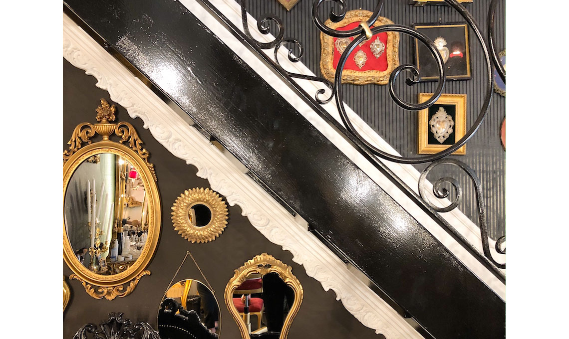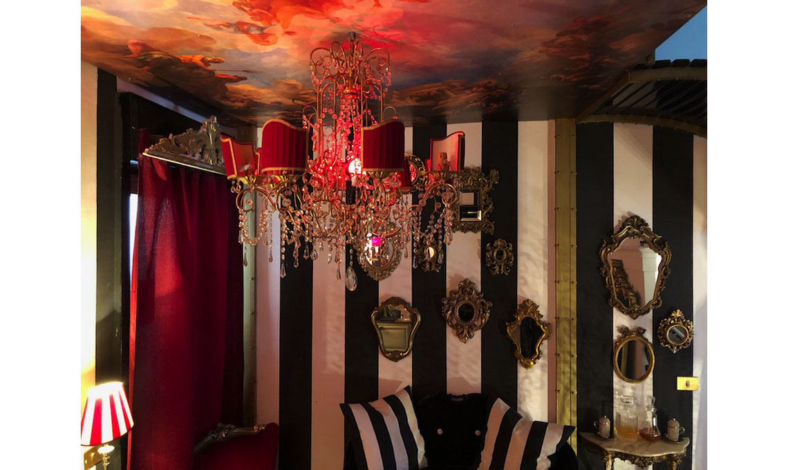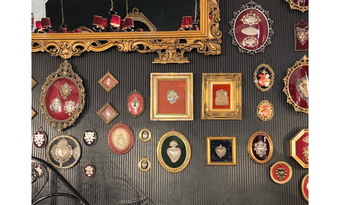 In equilibrio fra gli estremi, troviamo alle pareti innumerevoli ex-voto di cui il proprietario è collezionista, numerose specchiere e cornici dorate che riecheggiano lo stile rococò. La presenza di mobili in radica, velluti rossi e separé invece creano un’atmosfera “cipriata”, ammiccante ed allusiva. Il tutto ha come sfondo il bianco e nero delle pareti e degli stucchi realizzati ad hoc per il salone.