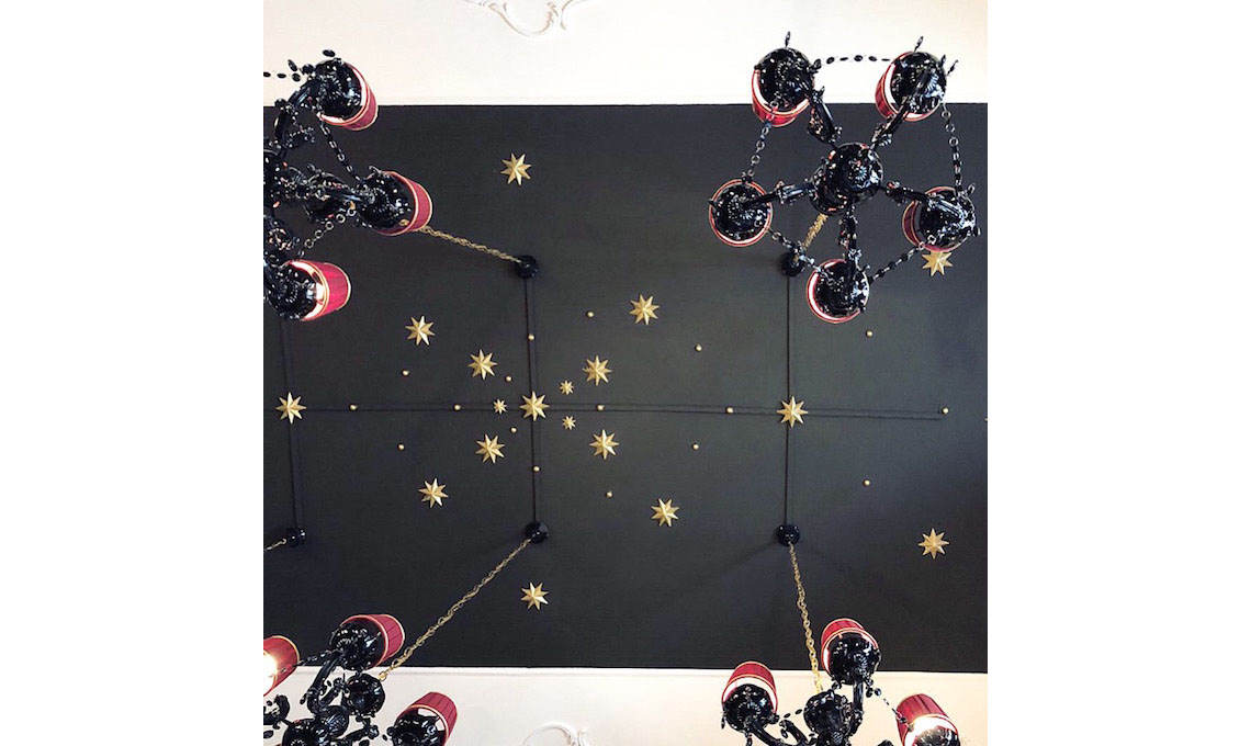 Un’altra affascinante soluzione la troviamo al soffitto, la boutique infatti, ci accoglie in un cielo nero e stellato, realizzato con inserti preziosi che vengono riproposti in tutto il negozio.
