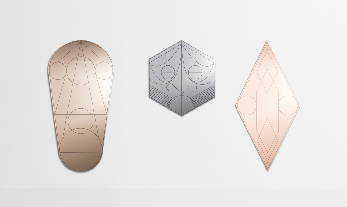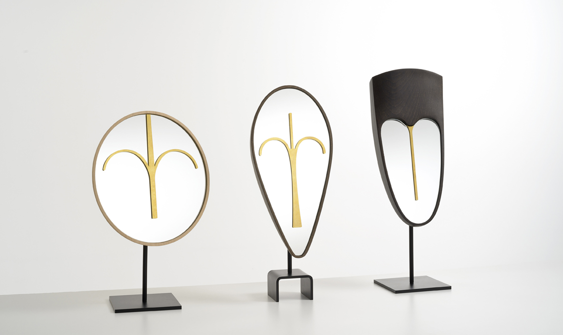 Mask è una serie di tre specchi geometrici colorati, con incisioni che ricordano quelle delle maschere africane [Federico Floriani per Petite Friture, €490]