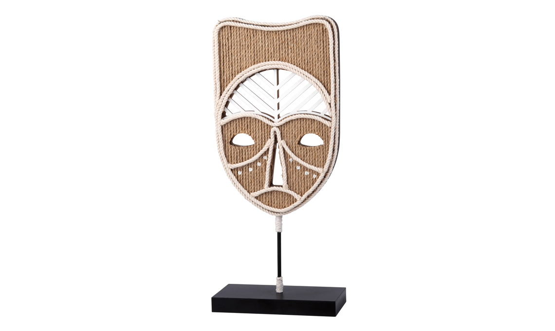 Una lampada-scultura ispirata alle maschere rituali Ngil della tribù Fang in Gabon. La luce è diffusa attraverso il metallo perforato e si irradia verso l'alto in una proiezione morbida e grafica [Sorcier di La Chance, €360]