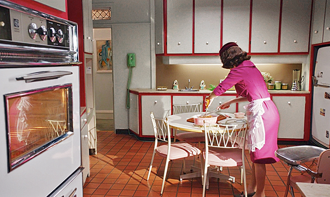 Frigorifero Retrò [Bompani € 1.019] e frullatore Diamond [KitchenAid € 199]. Pyrex non produce più la pirofila della linea White Daisy usata da Midge per il suo famoso arrosto, ma è simile Signature [€ 45]. Per il mood del salotto di casa Maisel, perfetti il divano Essentiel [Saba Italia, cm 220x95x83h € 2.604], il paravento Unfold [Ferm Living, cm 150x180h € 1.199] e il pouf Grandma [Bloomingville € 109].