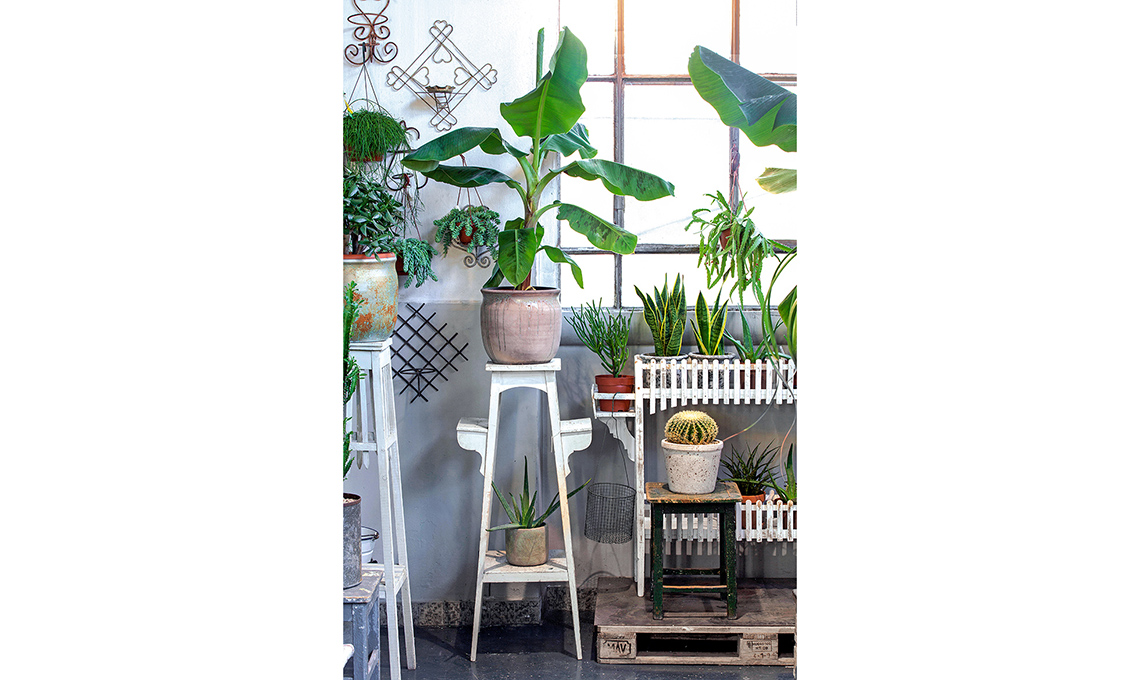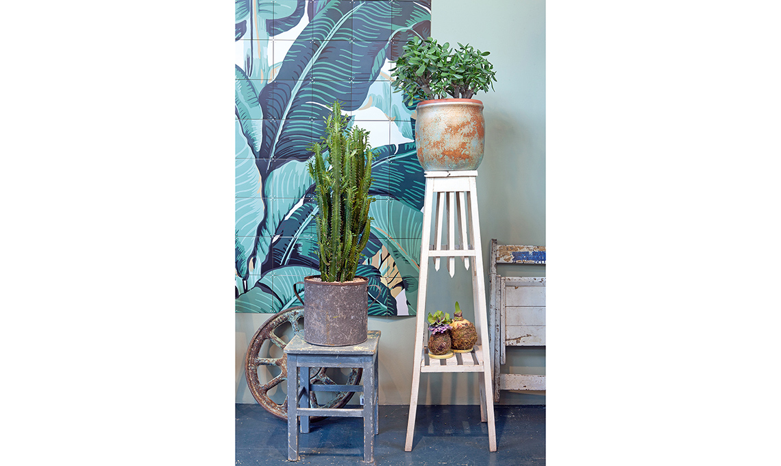 Pezzi unici di recupero, verniciati o lasciati con la loro patina screpolata. Trovi tutto, piante comprese, da Cargo Milano [Trespolo bianco, cm 40x110h €140]