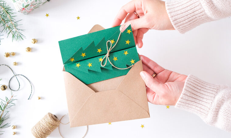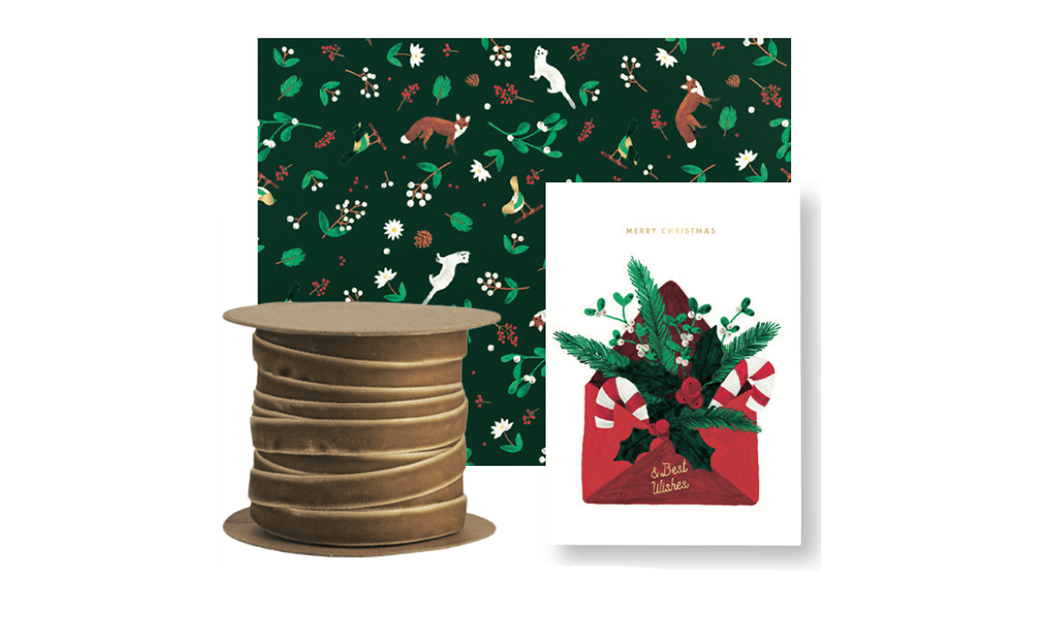 Carta con funivia [Pleased to Meet]. Chiudipacco stella e nastro di velluto [Sophie Allport].