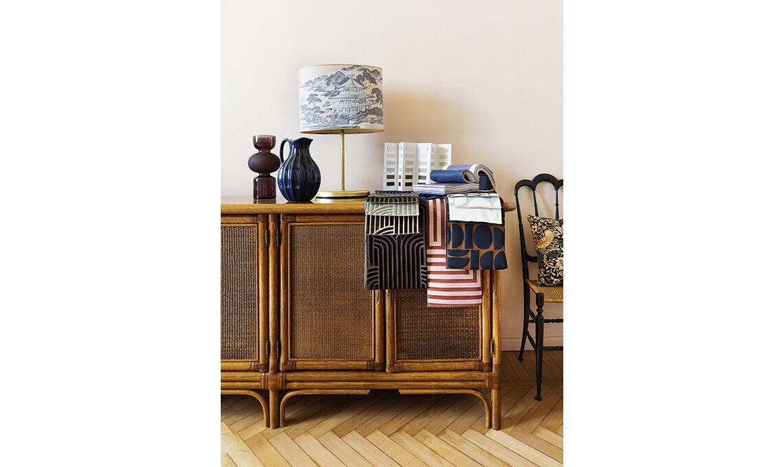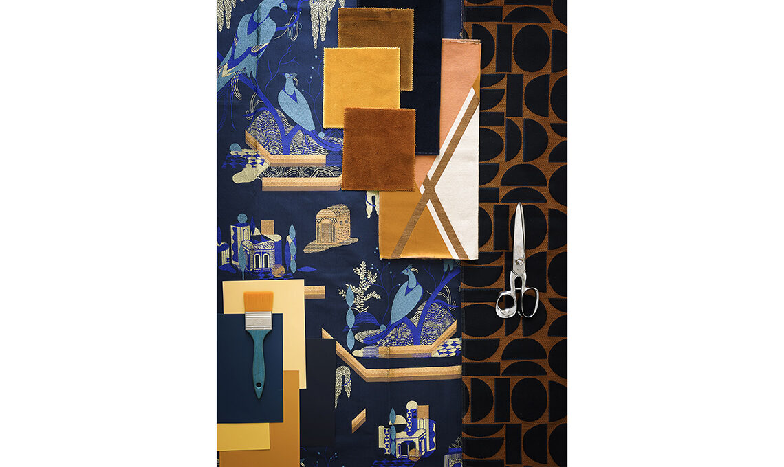 Tessuto jacquard This Must Be The Place [Dedar], velluti Dolce Vita [Casamance] e Emile Navy [Jane Churchill]. Tessuti Beaumont Rouille [Manuel Canovas] e Fjord [Lelièvre].