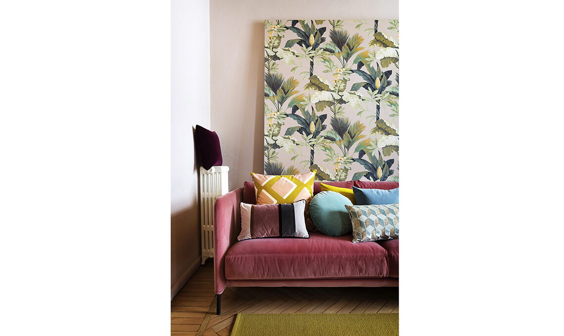 Osa una carta da parati jungle, ma soft nei toni e nei decori, per attualizzare lo stile.