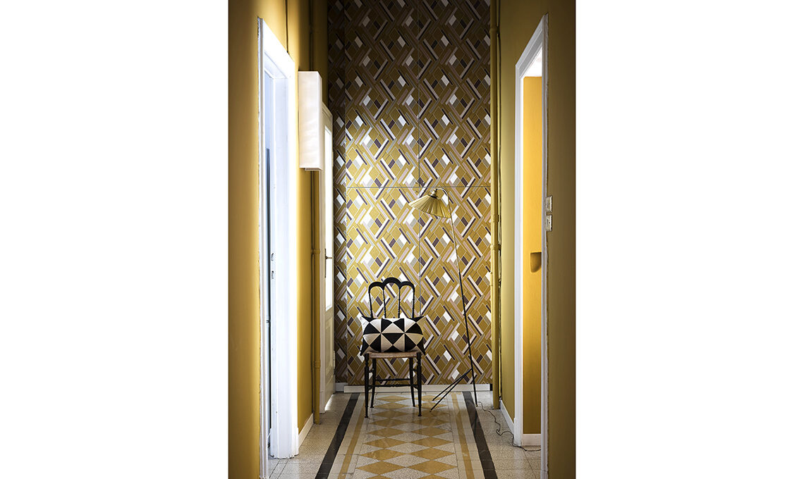 dai accento alle graniglie dipingendo le pareti con un colore che torna nei decori, e poi osa una carta da parati ‘wow!’ per rivestire una nicchia o un armadio con una geometria vintage in palette;