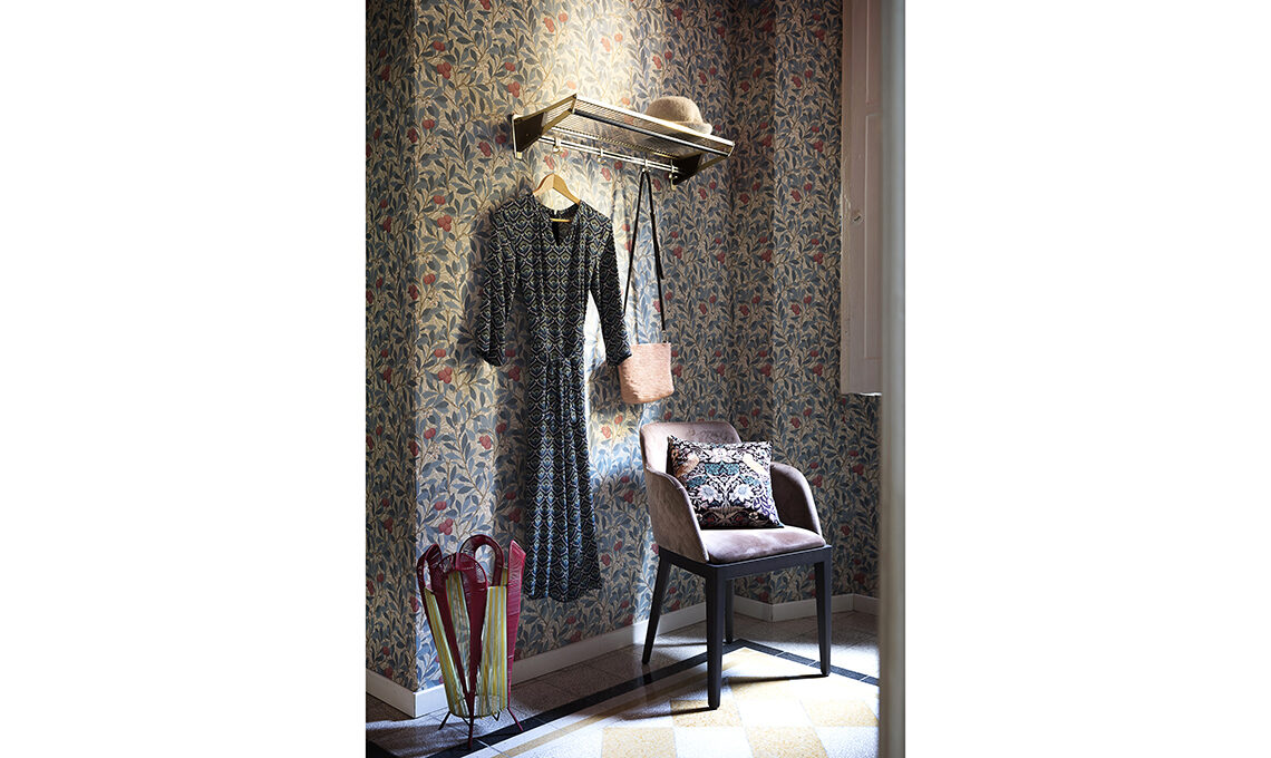 Il pannello è rivestito con la wallpaper Figari [Lelièvre]. Sedia e cuscino sono rivestiti con il velluto Strawberry Thief Velvet di Morris & Co. [Nuance Interni Tessili].