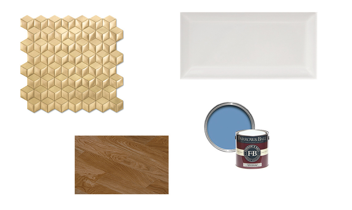 Piastrella Mosaico in ottone lucido inciso [De Castelli, cm 38x36], piastrella diamantata Hello [Marazzi, cm 15x7,5, pittura Cook’s Blue [Farrow & Ball €148 per 5 lt], parquet in rovere [Itlas].
