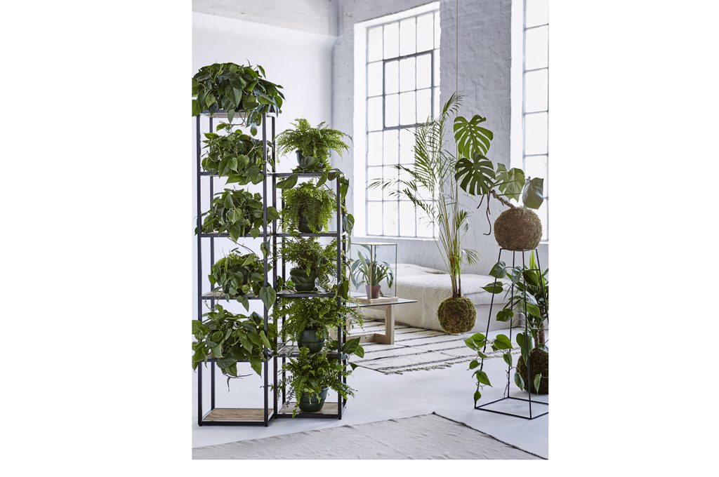3 Crea un separé verde dall'effetto vedo-non vedo semplicemente con degli scaffali freestanding carichi di philodendron scandens e felce nephrolepis. Oppure appendi al soffitto dei kokedama di muschio.