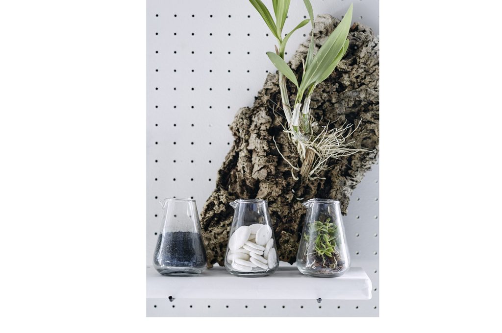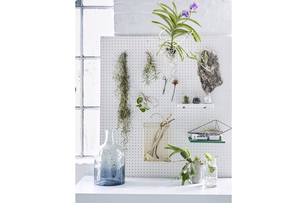 2 Un poliedrico 'pegboard' (il pannello traforato usato per l'attrezzatura del bricolage) qui diventa un insolito display per piante: micro orchidea, attaccata alla corteccia una cattleya, e piccole tillandsie (piante epifite che vivono senza terra). Il pannello forato è comodo perchè leggero e lo puoi appendere dove vuoi con dei semplici ganci; è versatile e permette di creare un angolo per le piante molto creativo e in continua trasformazione. Per agganciare le piante usa del fil di ferro!