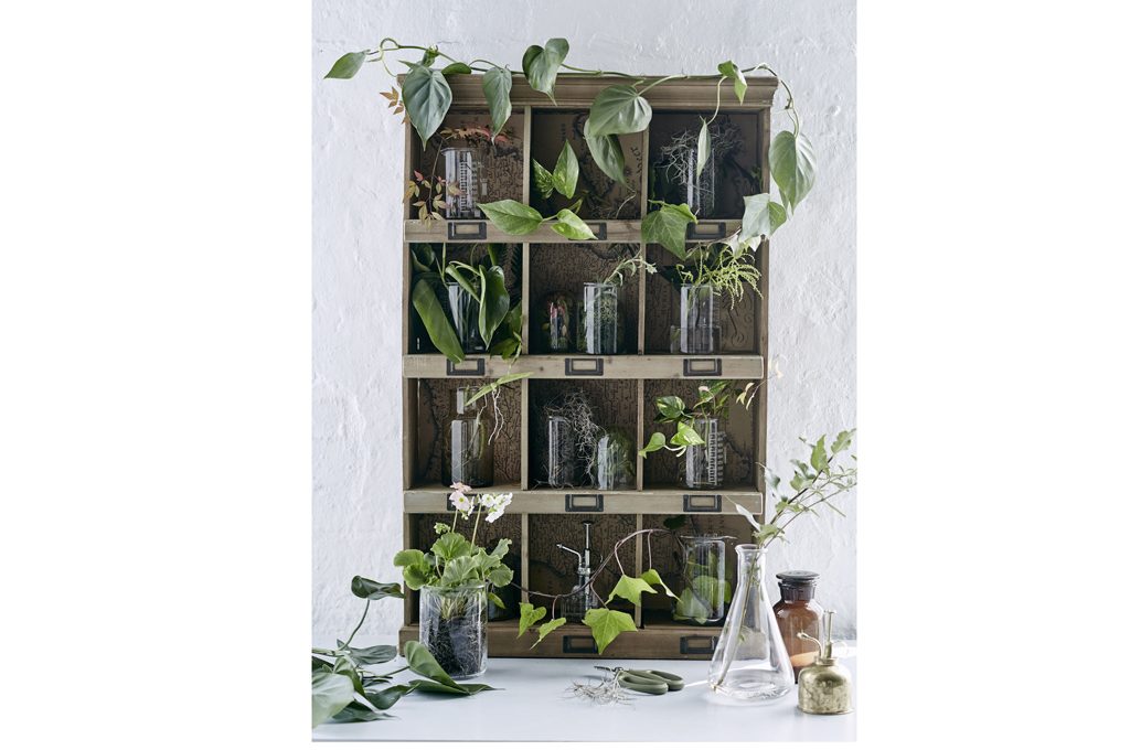 4 Ha il sapore dello studio botanico di epoca vittoriana questo vecchio schedario ricco di vasi in vetro da farmacia. All'interno, una collezione di talee e foglie di philodendron scandens, edera helix, piccole felci, schizanthus pinnatus e violetta africana.