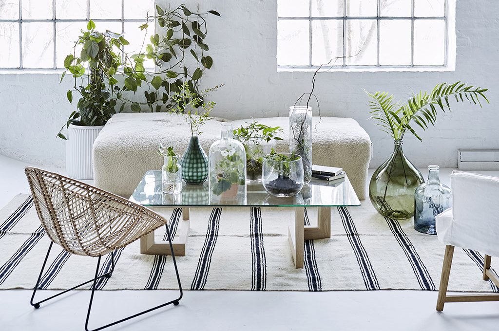 1 Guarda il soggiorno della foto e copia l'idea: pochi pezzi di design, colori neutri e le piante concentrate sul tavolino nei contenitori trasparenti. Sono felci, muschio bianco e una violetta africana. Tutto è contenuto dentro vecchie bottiglie, vasi e campane in vetro di recupero. Mentre le foglie del Philodendron scadens si arrampicano sulla parete, accolte da un graticcio molto minimal, quasi invisibile.