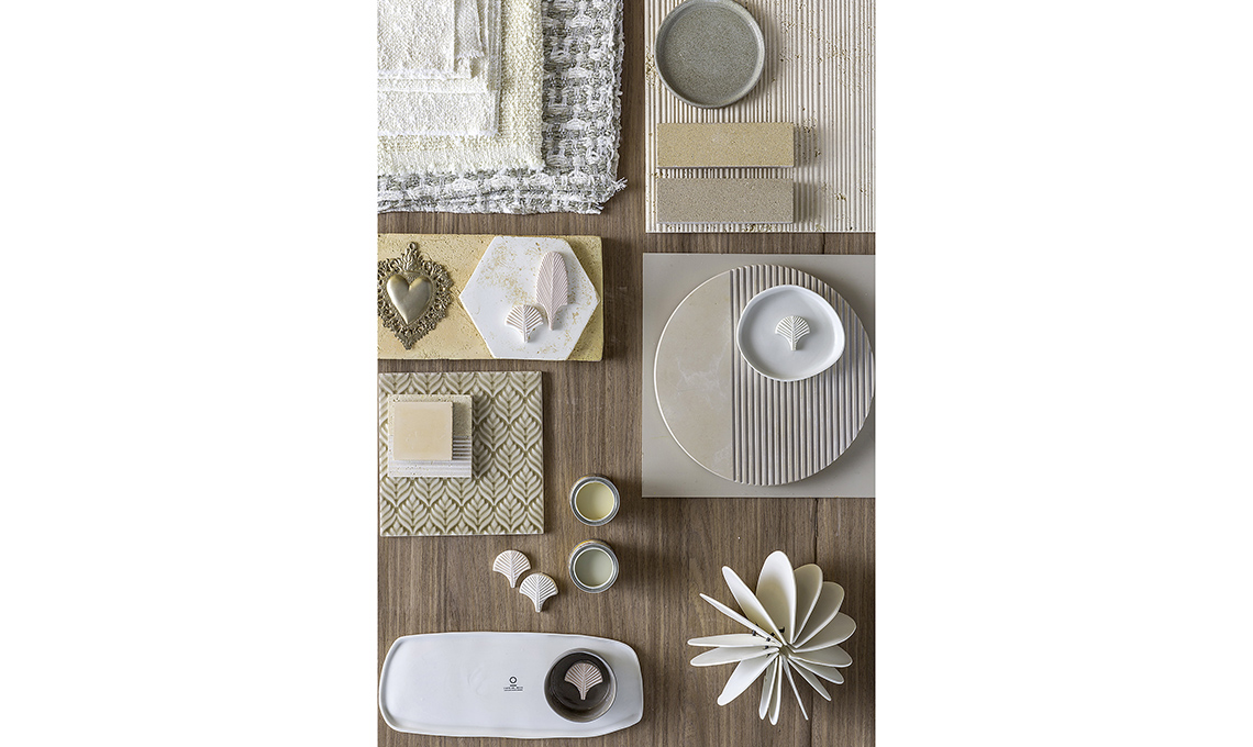 (sotto) in seta grezza [cm 133h € 137/m] di [Dedar] più, in mezzo, Isabelle in lana bouclé [Pierre Frey cm 126h € 227/m]; marmo rigato Bamboo Light Travertine [Salvatori], con mattonella Cromie Compact [La Pietra Compattata], piastrella esagonale Mirabello [Cotto Antiqua], tagliere tondo Trina [Manufatto Design] su resina George White [The Paint Makers], cementina quadrata [Popham Design] su piastrella Maison [Ceramiche Grazia] e decoro Plumage by Cristina Celestino [Botteganove], tutto da [Cantiere Galli Design]. Ex-voto Maria [Galleria Mia € 19], ceramiche [L’Arte nel Pozzo], latte colori [Farrow & Ball], legno sul fondo Xilo 2.0 Wallnut Planked [Alpi].