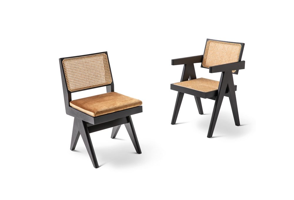 Conference Chair: teak massello del Punjab e rattan naturale, realizzata a mano sul disegno della sedia di Jeanneret [Dimo Chair, cm 51x54x/79h]
