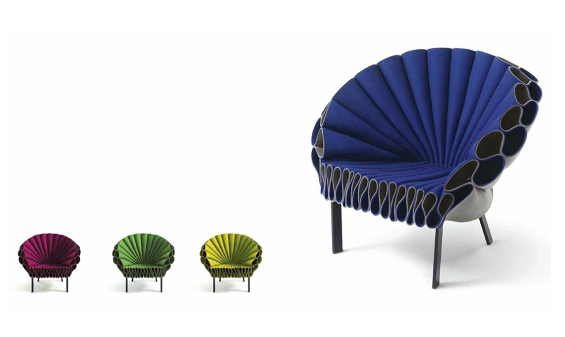 La rivisitazione più originale di tutte? La poltrona Peacock di Dror Benshetrit per Capellini, coloratissima e realizzata nel 2009. Si tratta di un modello composto esclusivamente con fogli di feltro ripiegati e uniti da un perno! Un vero pavone...