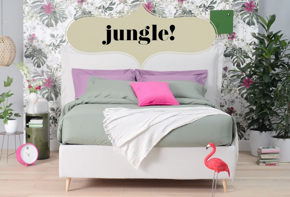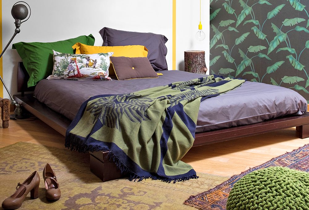 - riprendi lo stile esotico nei tessili, foglie e richiami tropicali sui cuscini del letto mixati tra loro