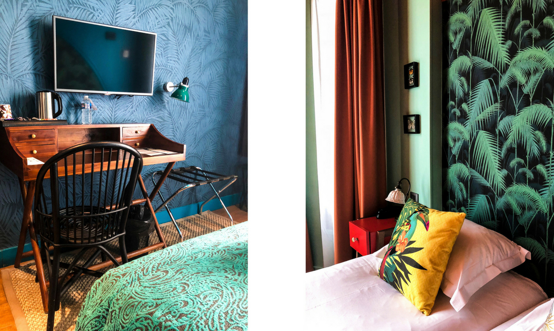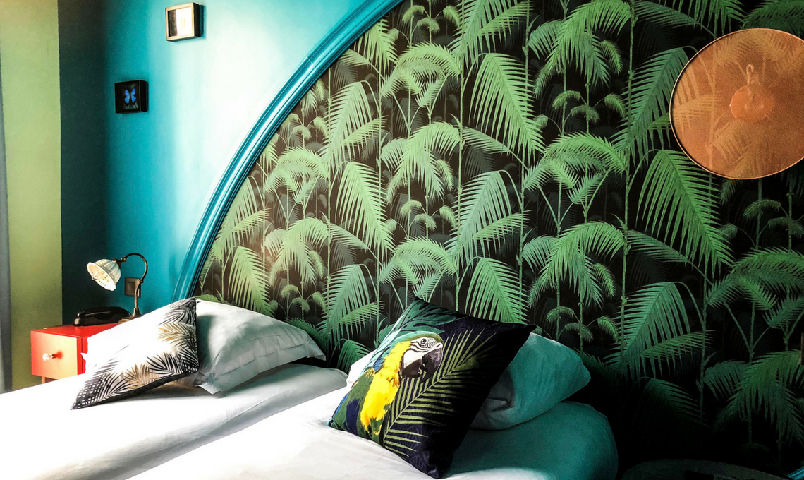 Le camere di questo sfarzoso hotel a Nizza sono infatti decorate principalmente attraverso il colore: sono un'esplosione di eccentricità e colore puro che si abbina a ridondanti richiami alla natura e lussureggianti decorazioni, tipiche anche dello stile jungalow.