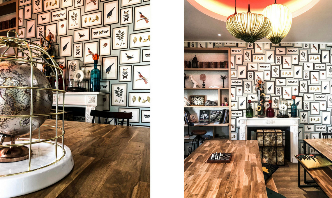 Le carte da parati a tema tropicale con foglie o animali decorano le pareti delle camere come testata del letto: seguono la cornice decorativa in gesso formando dolci archi sul muro. La vegetazione ripresa nei vari pattern è interpretata secondo un'ottica scientifica, quella di un viaggiatore esotico che racconta sui suoi taccuini di specie e natura selvaggia che incontra durante i suoi viaggi.
