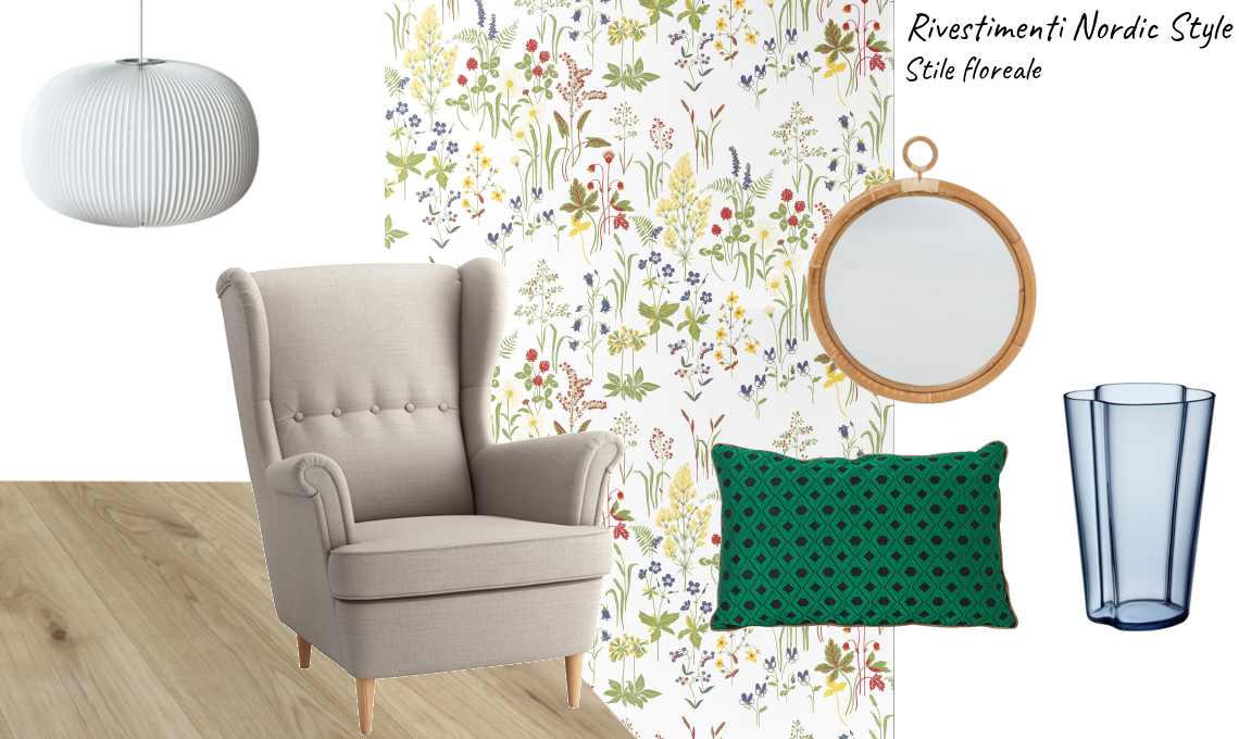 Carta da parati Flora di Sandberg – Parquet in rovere nodino europeo di Cadorin – Poltrona Strandmon di Ikea – specchio Ella di Sika-Design – cuscino Ferm Living – vaso Aalto di iittala – lampada a sospensione Lamella 132 di Le Klint