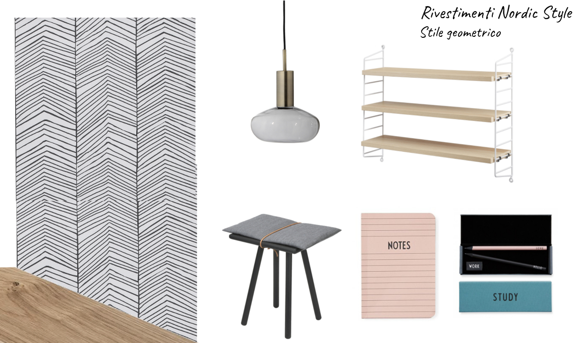 Carta da parati Herringbone Wallpaper di Ferm Living – parquet prefinito rovere Class color miele di Leroy Merlin – sgabello George stool di Skagerak – scaffale String pocket – notebook e astuccio portapenne di Design Letters – lampada a sospensione Enostudio