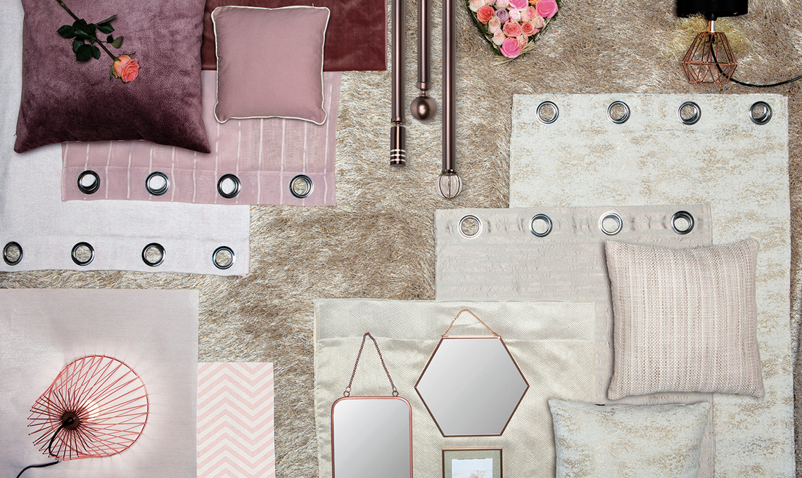 Nella moodboard: sospensione Empire in metallo color rame - €39,90, tenda Velvet 140x280 cm - €49,90, cuscino Gioiello 30x30 cm - €11,90, carta da parati - €29,99 (ref. 36298255), cuscino Elda 40x40 cm - €21,99. Tutto Leroy Merlin