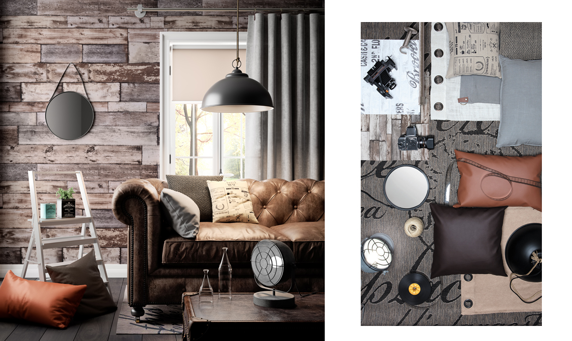 Nella moodboard: lampada da tavolo Carmen - €70, tenda Lina, 100% lino, 140x280 cm - €64,90, cuscino Silvia marrone, in ecopelle, 40x60 cm - €22,99, carta da parati Legno antico - €9,99, cuscino Silvia, in ecopelle, 50x50 cm - €22,99. Tutto Leroy Merlin