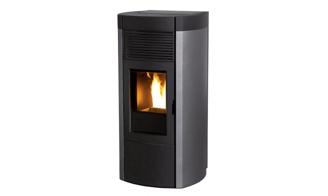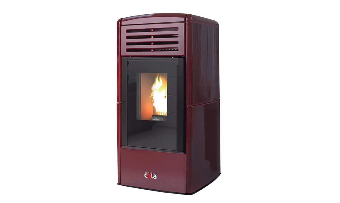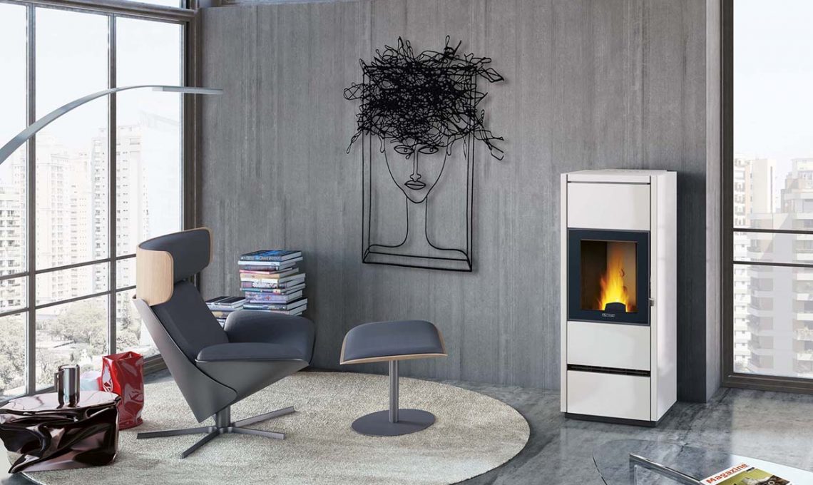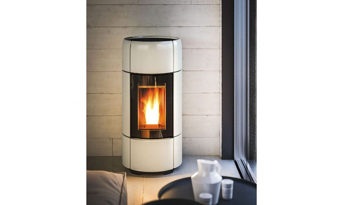 A pellet. Rivestita in acciaio verniciato e maiolica e dotata di camera di combustione ad alto rendimento, Pupilla è la stufa a pellet a programmazione elettronica che, regolabile mediante comandi digitali o telecomando, puoi accendere e spegnere a orari prestabiliti [Anselmo Cola, cm 52,4x53,9x104h prezzo su richiesta].