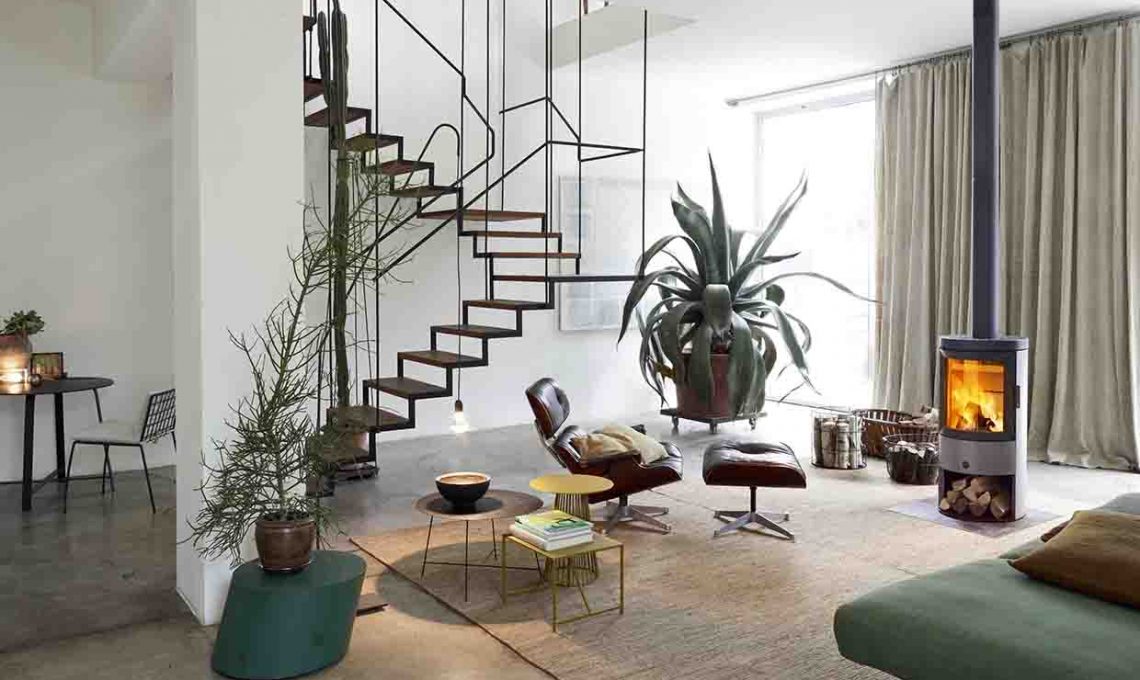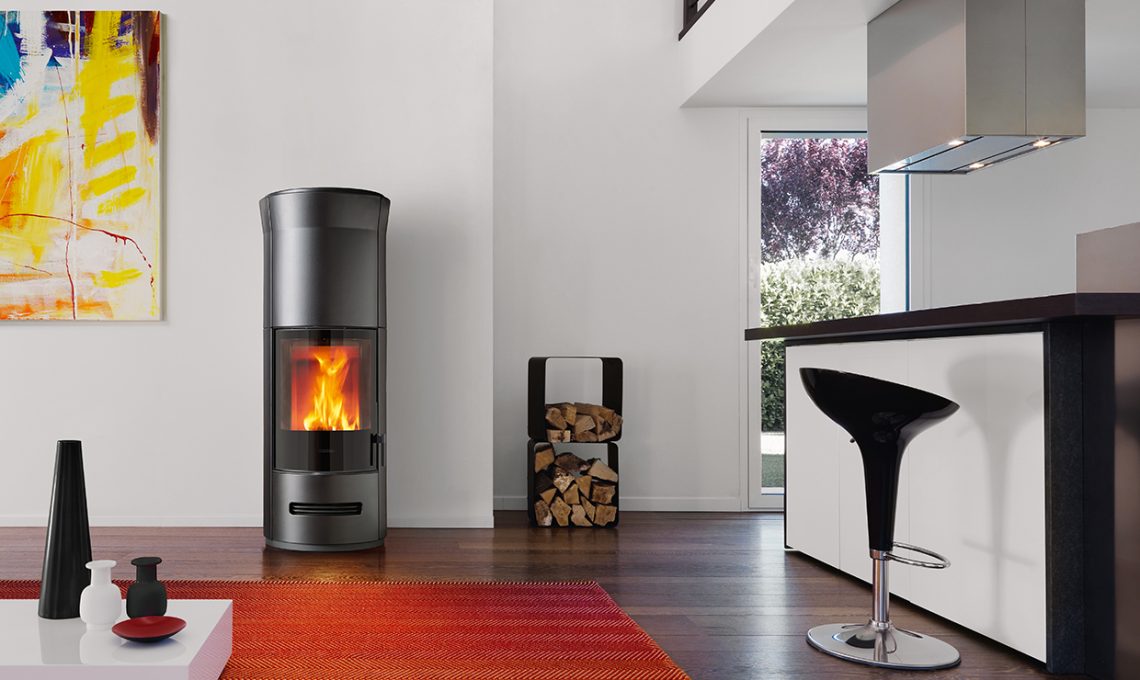 A legna. Dotata di una presa posteriore che preleva l’aria direttamente dall’esterno, la stufa di design a legna Eva integra un sistema di controllo e di regolazione dell’aria che permette di modulare la potenza e l’intensità della fiamma [Palazzetti, cm 44x43x124h da €1.800].
