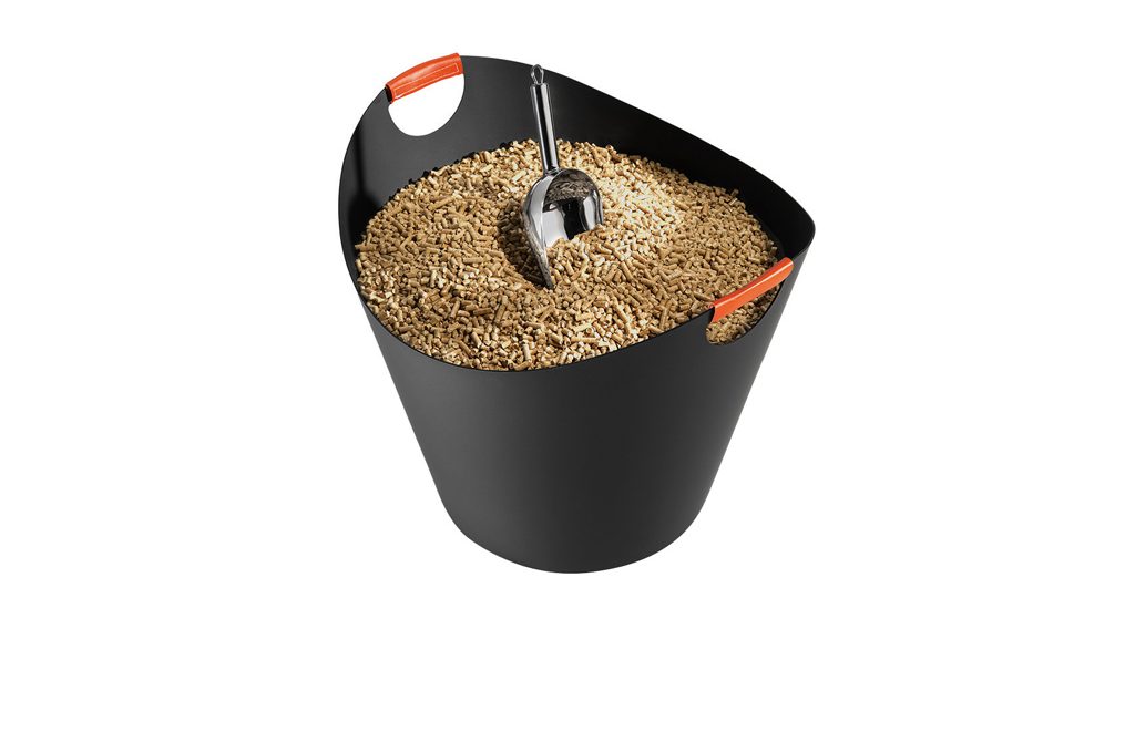 Portapellet in lamiera antigraffio, Ivo contiene fino a 15 Kg di eco-combustibile. Anche con maniglie in grigio, bianco, verde e beige [Apros, cm Ø 53x45h € 232].