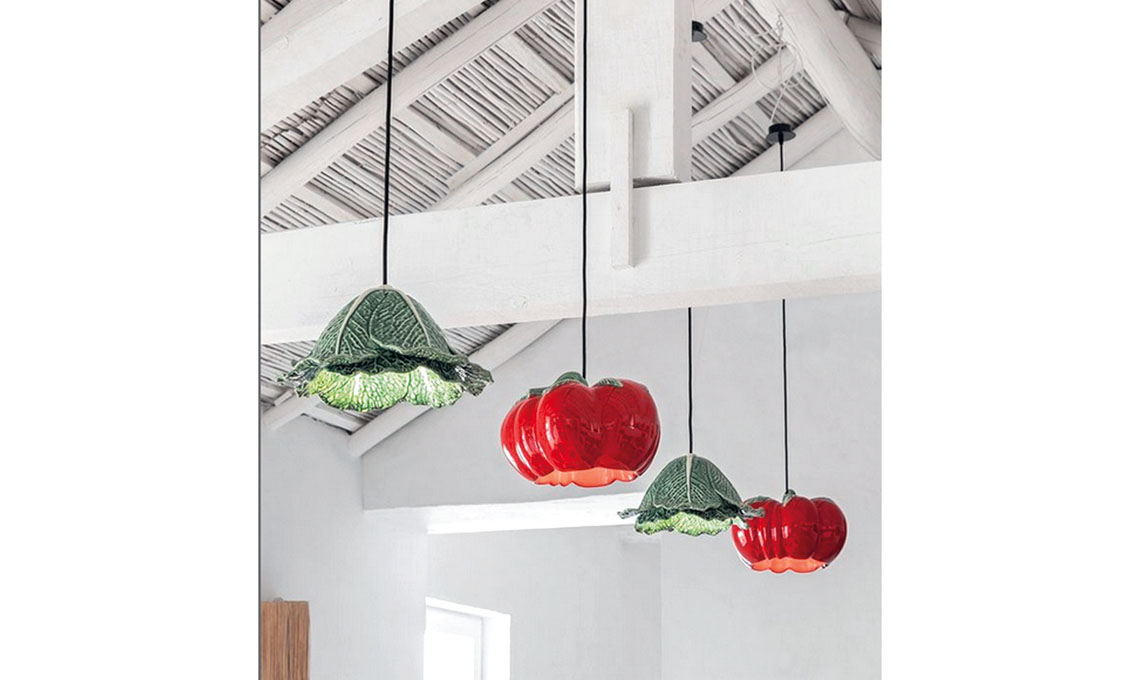 Pomodori e insalata… sì, ma in versione maxi e che magicamente si accendono e diventano insoliti lampadari. E che dire dell’anguria, a fette o spremuta, servita nelle sue repliche in ceramica? Mai più senza. @bordallopinheiroofficial
