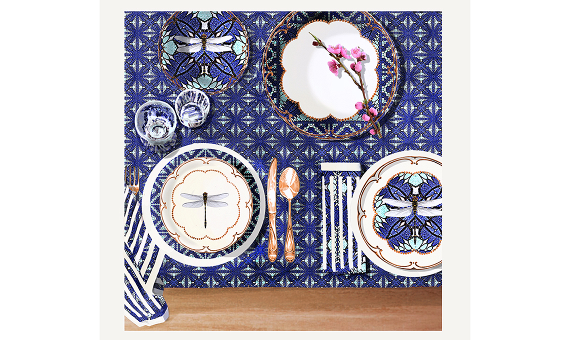 Le libellule sono un portafortuna, si sa... ma queste, realizzate con un effetto caleidoscopio multicolorato, sono uniche. Volano leggere e si posano sui piatti di vetro, su cuscini e runner. Dalla ‘tapestry collection’ di Bettina Casanova. @bettinabon