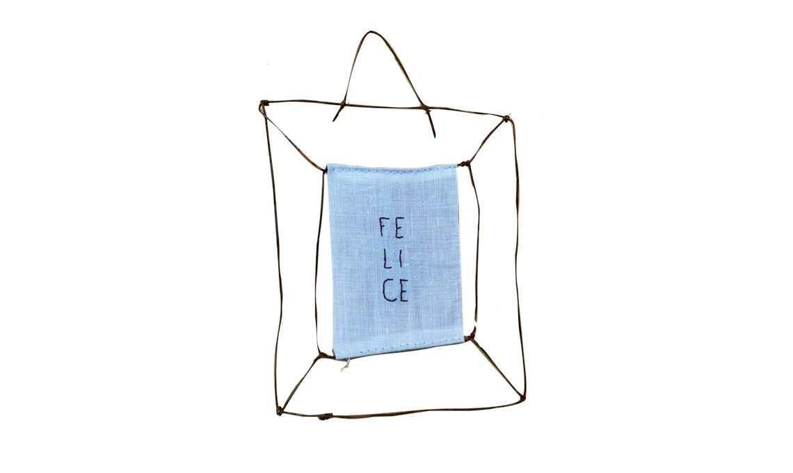 Una cornice in esile fil di ferro piegato a mano e dentro parole cucite su garza sottile, parole che arrivano dritte al cuore.