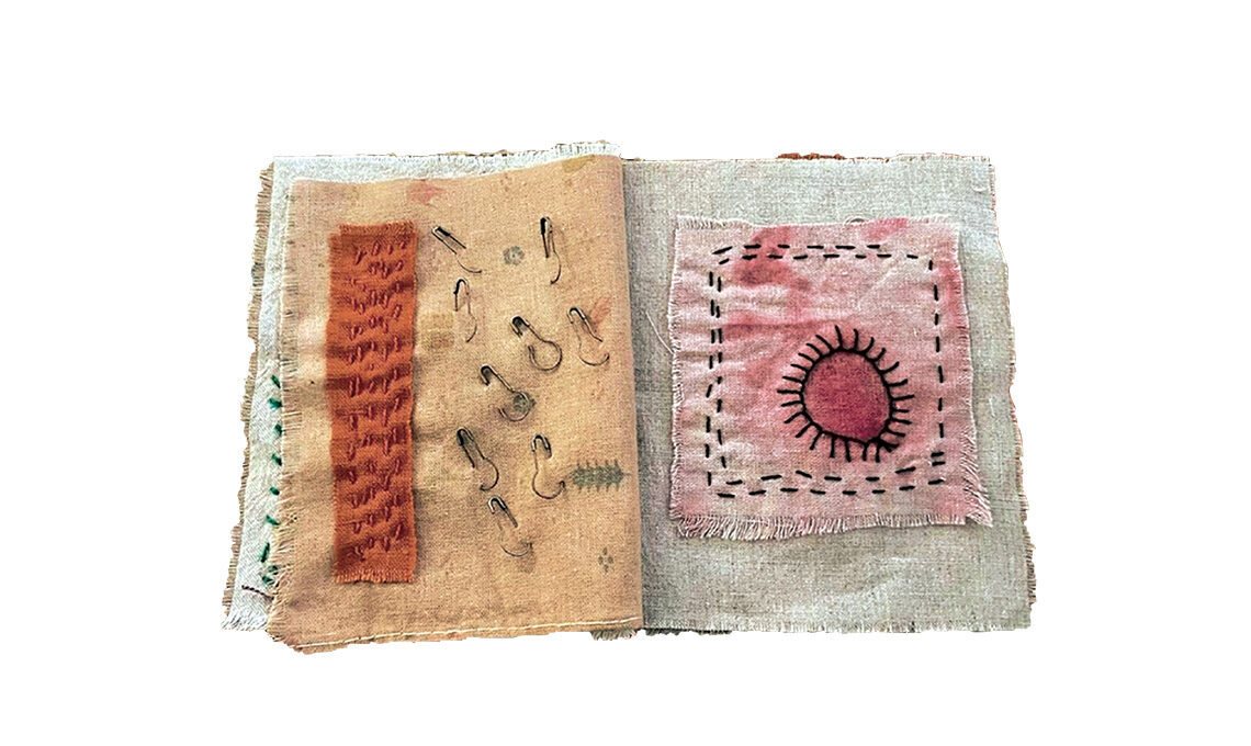 La tecnica è quella del ricamo stitching, piccoli punti imperfetti che può fare anche un bambino... Ma negli album di stoffa di Emma Freeman (artista buddista, poetessa) c’è un vero percorso di autocoscienza.