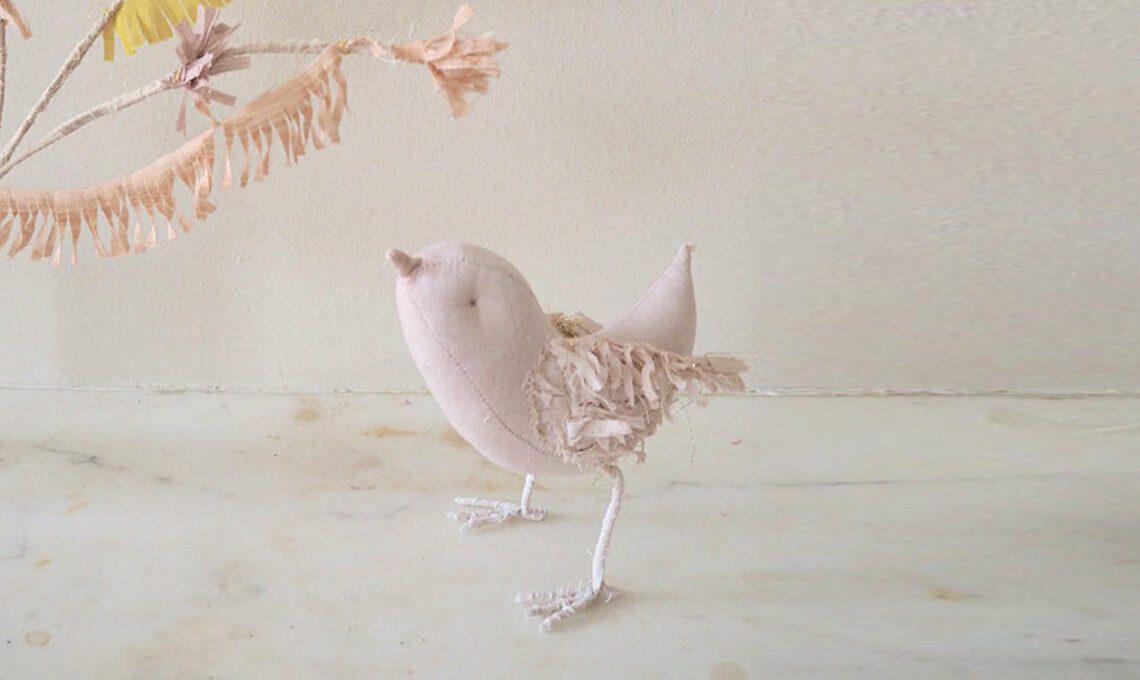 Perché l’ho scelto? Questo uccellino in tessuto tinto con avocado, fatto a mano da Fanny nel suo studio di Londra, le ali cucite con filo d’oro, è di una bellezza commovente... ecco perché.