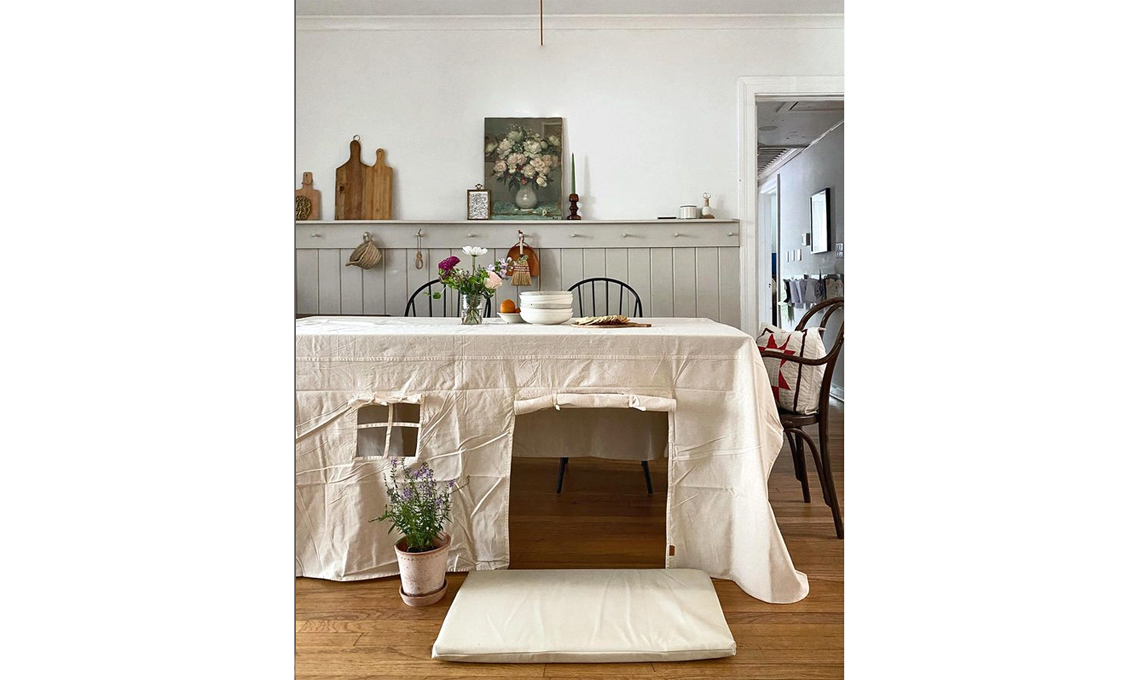 Tutti attorno al tavolo, sì, ma che bello per i piccoli potersi rifugiare ‘sotto’, in uno spazio dedicato a giochi, risate e (l’abbiamo fatto tutti, no?!) scherzi agli adulti. La tenda-tovaglia è irresistibile: chissà che non venga voglia anche ai grandi di tornar bambini. battenhome.co