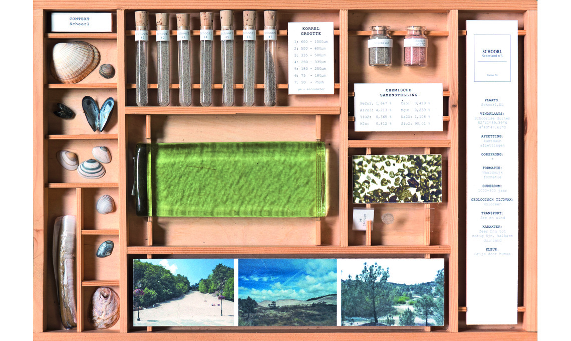 _Nadine Sterk e Lony van Ryswyck di Atelier NL sono ricercatrici e la loro missione è creare legami più forti tra i materiali della terra e le comunità viventi. Qui una 'scatola del collezionista' tratta dal progetto di ricerca 'Viaggio di sabbia' in cui hanno prelevato campioni di 80 tipi di sabbia, mappandoli, classificandoli e testandoli per crearne li vetro di riferimento. Generando una libreria di vetro che mostra diversi colori, opacità e motivi di cristallizzazione.