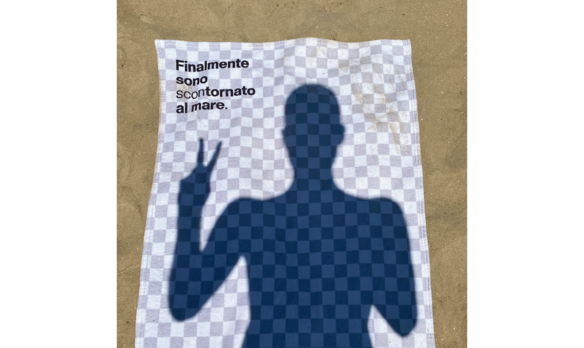 Francesco è logo designer e ironizza sul mestiere del creativo ricorrendo a giochi di parole. Qui il telo mare in produzione per l’estate, tutto a quadretti bianchi e grigi (trama molto conosciuta per chi è del settore grafico: rappresenta lo sfondo trasparente e le immagini scontornate) dice: ‘Finalmente sono scontornato al mare’.