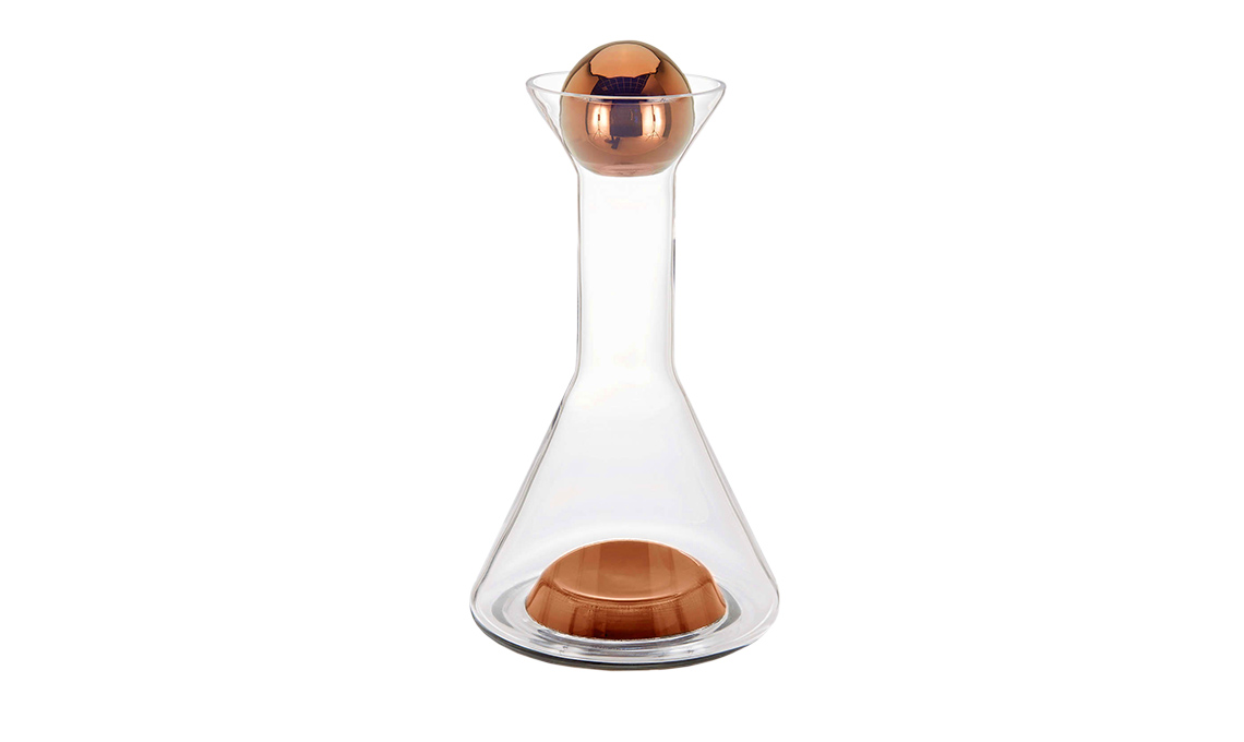 - Il decanter in vetro soffiato di Tom Dixon ha un tappo sferico color rame.