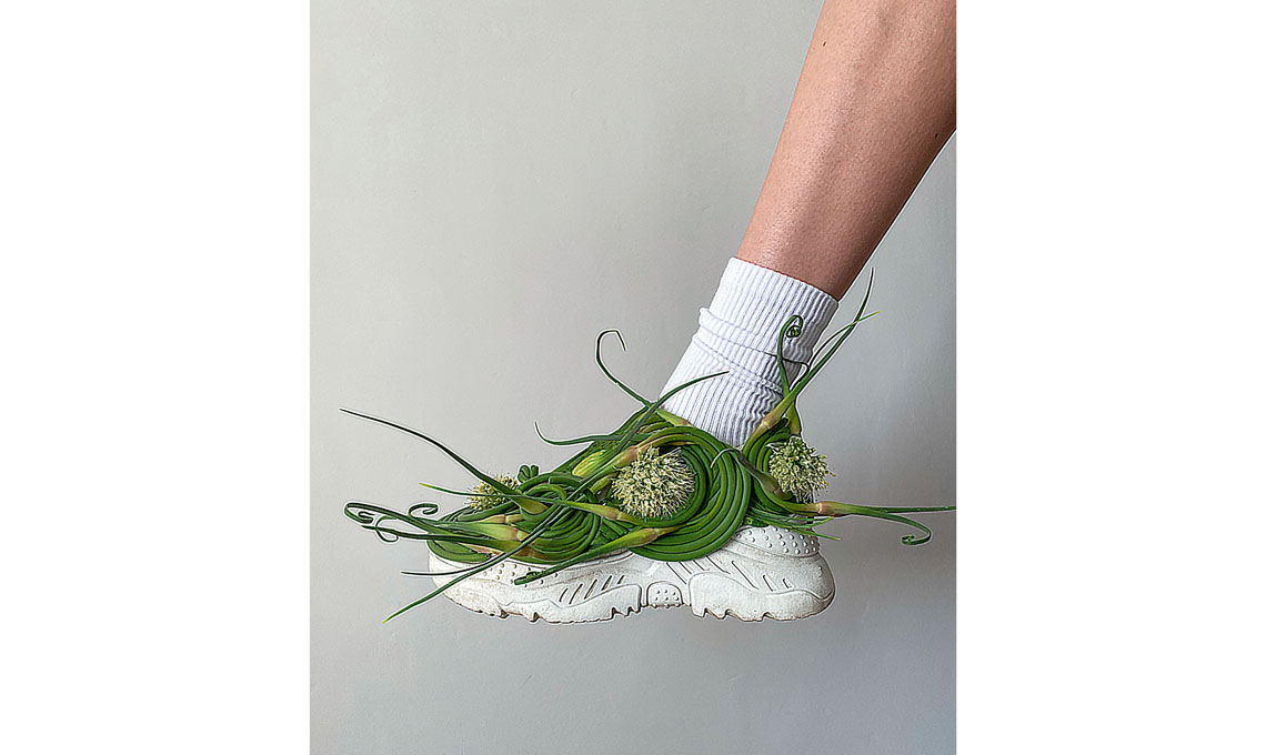Katerina Shukshina ama giocare con le verdure per creare nuovi ‘abiti e accessori’ di uso comune. Qui ci sono le sue sneakers germogliate fatte intrecciando fiori di cipolla. Guarda caso la modesta cipolla è originaria dell’Asia ed è una coltura da rinnovo, apre la rotazione delle colture agricole.