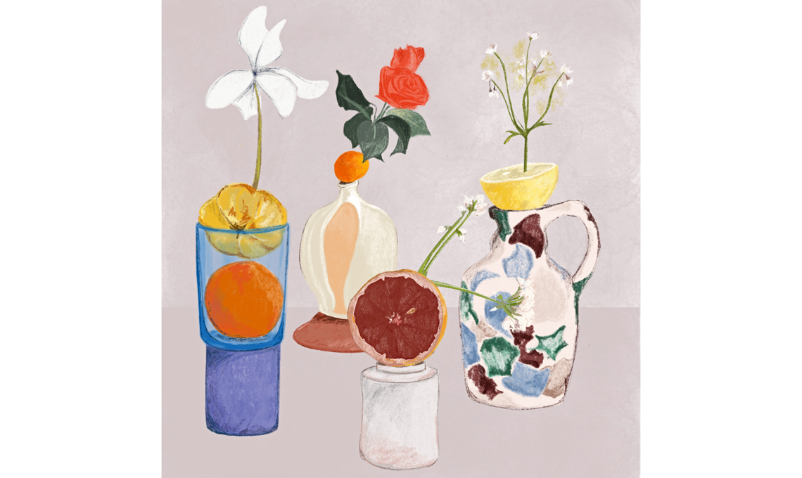 Irma Donadio è illustratrice e architetto. Tramite un uso appassionato dei colori cerca di trasmettere la bellezza che trova nei dettagli della quotidianità. Qui le stoviglie, tra fiori e frutti, sono in posa in un equilibrio improbabile, ma molto décor.
