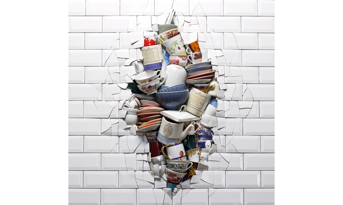 Ivan Tozzo usa la sua conoscenza del mosaico reinterpretandolo con caparbietà, rincorrendo tessere e colori per creare sculture moderne. Qui con ‘Le mie tazze rotte’ stipate e strabordanti dal muro piastrellato, forse vuole ricordarci quanto vasellame usiamo nella nostra vita.