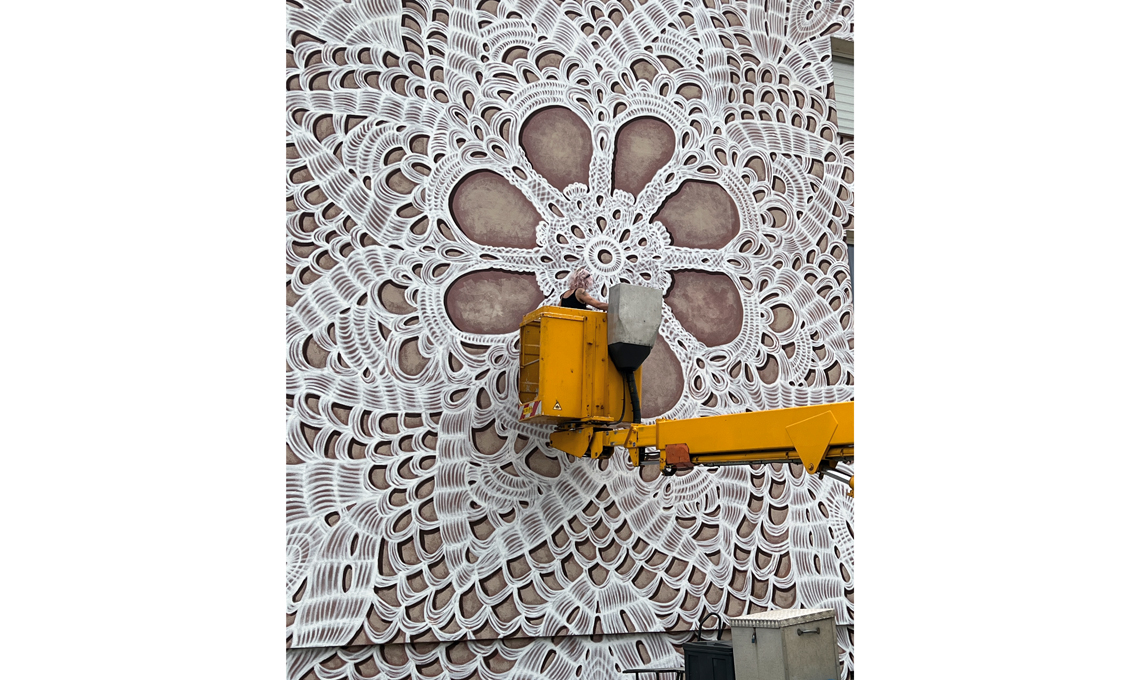 @nes.nespoon è nota per i suoi pizzi-murales. Nell’intimo, ci riporta alla femminilità fatta di merletti e di donne che ricamano e si confrontano sui problemi quotidiani. Un ricordo d’infanzia ma anche il richiamo alle forme